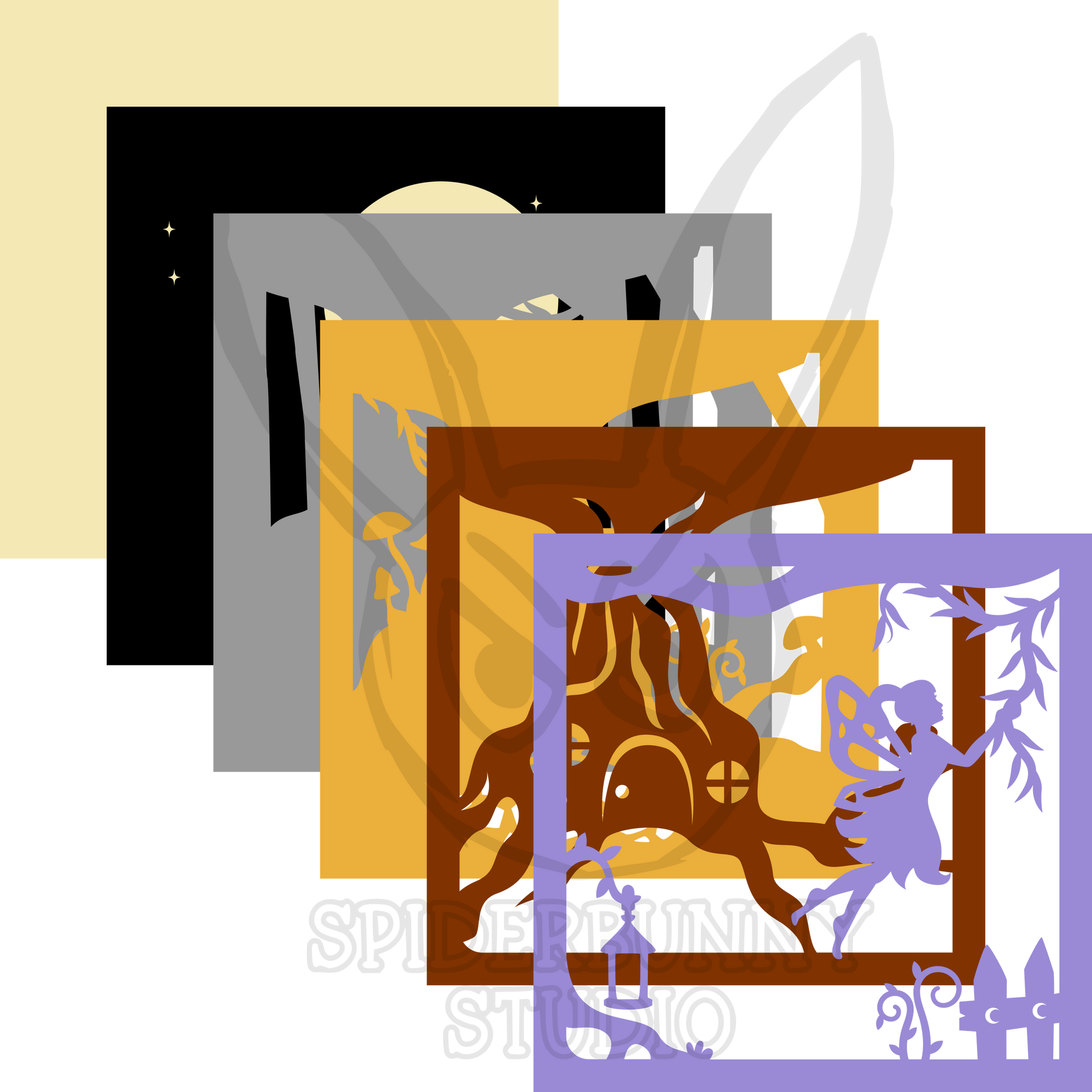 The Fairy by the Treehouse kit contains 6 layers and 6 paints, in lilac, brown, ochre, black, grey and sand