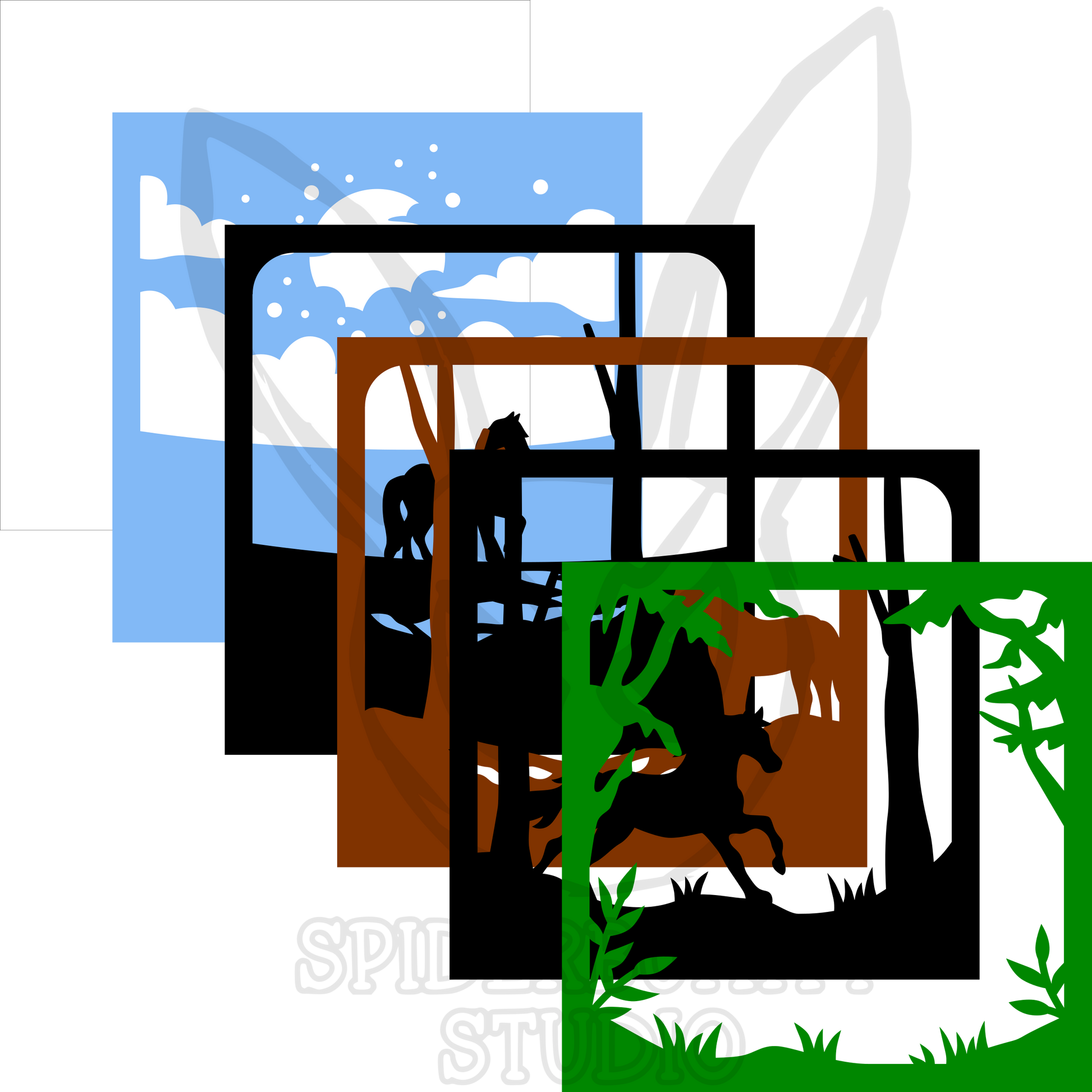 The Horses in the Forest kit contains 6 layers and 6 paints, in dark green, black x2, brown, light blue and white.