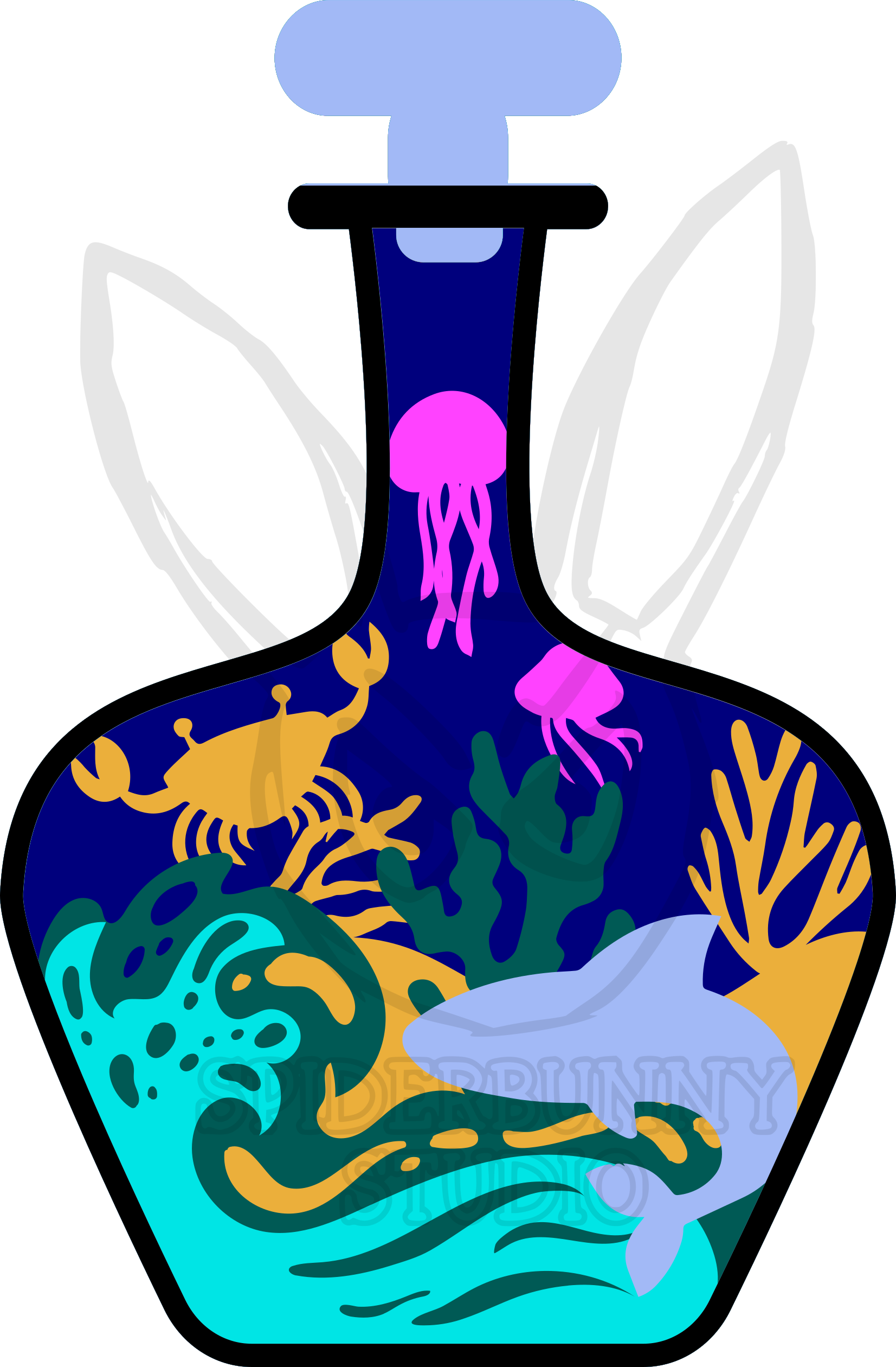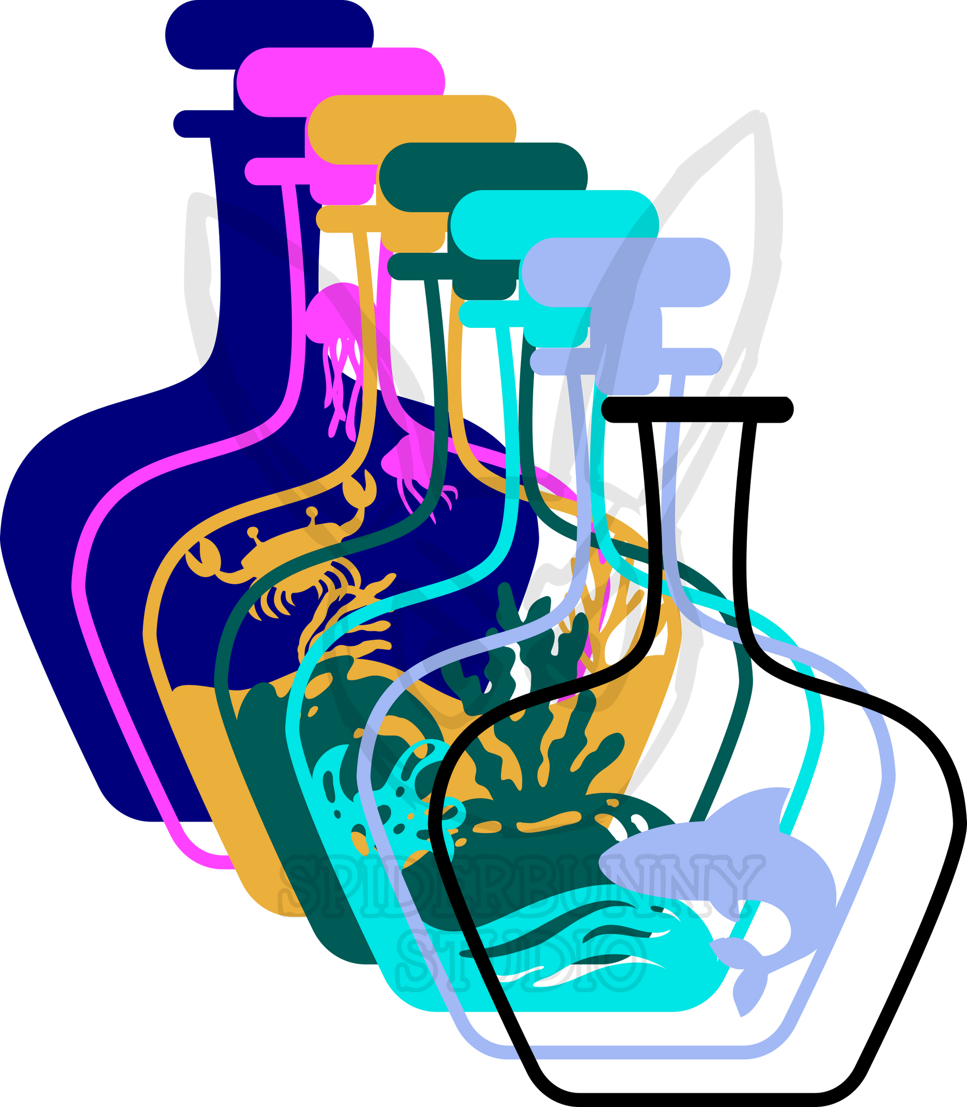 The Shark in a Bottle Large kit contains 7 layers and 8 paints, in black, light blue, aqua, teal, ochre, light pink, dark blue and white.